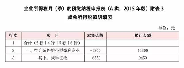 因為2015年10月施行新的稅收優(yōu)惠政策,所以2015年第四季度企業(yè)所得稅申報與以往的季度或年度申報有所不同,小型微利企業(yè)應注意,必須填報的附表3《減免所得稅額明細表》有很多特殊的填報方式。
