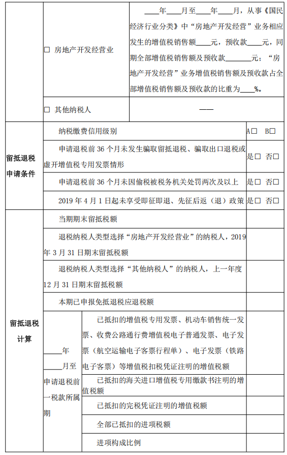 十三、退稅納稅人類型:按照《財政部 稅務(wù)總局關(guān)于完善增值稅期末留抵退稅政策的公告》(財政部 稅務(wù)總局公告 2025 年第 7 號,以下簡稱 7 號公告)第一條第一項規(guī)定申請留抵退稅的納稅人,根據(jù)其“制造業(yè)”“科學(xué)研究和技術(shù)服務(wù)業(yè)”“軟件和信息技術(shù)服務(wù)業(yè)”“生態(tài)保護(hù)和環(huán)境治理業(yè)”中銷售收入占比最高的一項選擇;按照 7 號公告第一條第二項規(guī)定申請留抵退稅的納稅人,選擇“房地產(chǎn)開發(fā)經(jīng)營業(yè)”;按照 7 號公告第一條第三項規(guī)定申請留抵退稅的納稅人,選擇“其他納稅人”。退稅納稅人類型選擇“制造業(yè)”“科學(xué)研究和技術(shù)服務(wù)業(yè)”“軟件和信息技術(shù)服務(wù)業(yè)”或“生態(tài)保護(hù)和環(huán)境治理業(yè)”的納稅人,應(yīng)填寫“ 年 月至 年 月,從事《國民經(jīng)濟(jì)行業(yè)分類》中‘制造業(yè)’‘科學(xué)研究和技術(shù)服務(wù)業(yè)’‘軟件和信息技術(shù)服務(wù)業(yè)’‘生態(tài)保護(hù)和環(huán)境治理業(yè)’業(yè)務(wù)相應(yīng)發(fā)生的增值稅銷售額 元,同期全部增值稅銷售額 元,占比 %。”如申請退稅前經(jīng)營期滿 12 個月,本欄起止時間填寫申請退稅前 12 個月的起止時間,本欄銷售額填寫申請退稅前 12 個月的銷售額;如申請退稅前經(jīng)營期不滿 12 個月但滿 3 個月的,本欄起止時間填寫實際經(jīng)營期的起止時間,本欄銷售額填寫實際經(jīng)營期的銷售額。退稅納稅人類型選擇“房地產(chǎn)開發(fā)經(jīng)營業(yè)”的納稅人,應(yīng)填寫“ 年 月至 年 月,從事《國民經(jīng)濟(jì)行業(yè)分類》中‘房地產(chǎn)開發(fā)經(jīng)營’業(yè)務(wù)相應(yīng)發(fā)生的增值稅銷售額 元,預(yù)收款 元,同期全部增值稅銷售額及預(yù)收款元,‘房地產(chǎn)開發(fā)經(jīng)營’業(yè)務(wù)增值稅銷售額及預(yù)收款占全部增值稅銷售額及預(yù)收款的比重為 %?!比缟暾埻硕惽敖?jīng)營期滿 12 個月,本欄起止時間填寫申請退稅前 12 個月的起止時間,本欄銷售額和預(yù)收款填寫申請退稅前 12 個月的銷售額和預(yù)收款;如申請退稅前經(jīng)營期不滿 12 個月但滿 3 個月的,本欄起止時間填寫實際經(jīng)營期的起止時間,本欄銷售額和預(yù)收款填寫實際經(jīng)營期的銷售額和預(yù)收款。